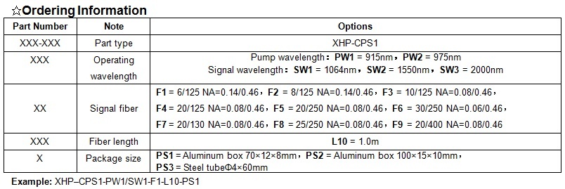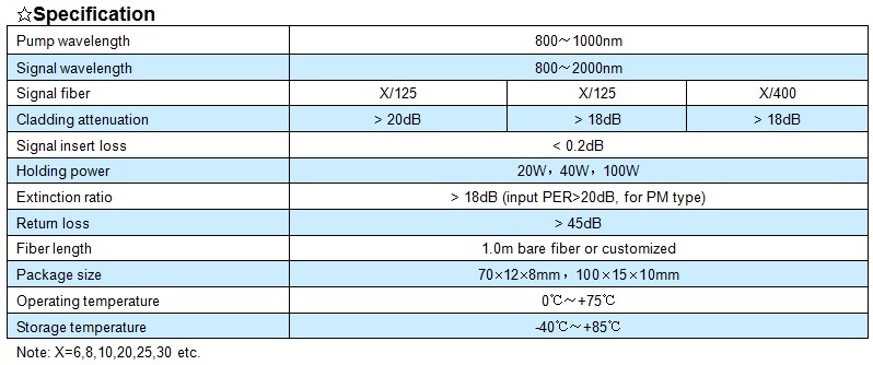 Fiber cladding power stripper(CPS) features low signal insert loss and laser beam degradation, high stripping efficiency, high extinction ratio, stable and reliable. This CPS can be integrated into medium and high power fiber laser, amplifier, and R&D test equipment.