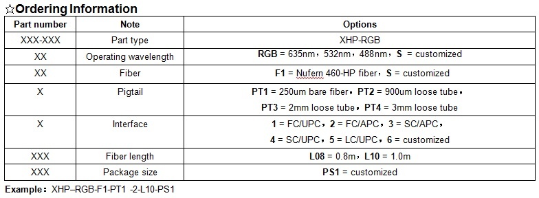 XHP RGB fiber combiner features low insert loss, stable and reliable. It can be integrated into fiber communication system, fiber sense, laser microscope, laser display, and biomedicine etc.