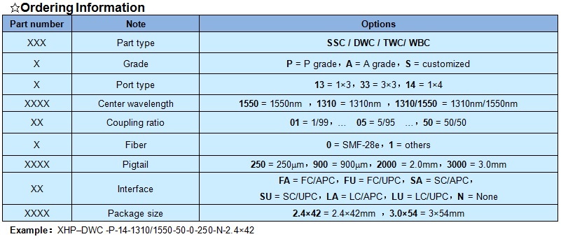 XHP 1×3/ 1×4 single mode fiber coupler features low insert loss, high return loss, low PDL, stable and reliable. It can be integrated into fiber communication network, fiber sense system, and fiber test equipment etc.