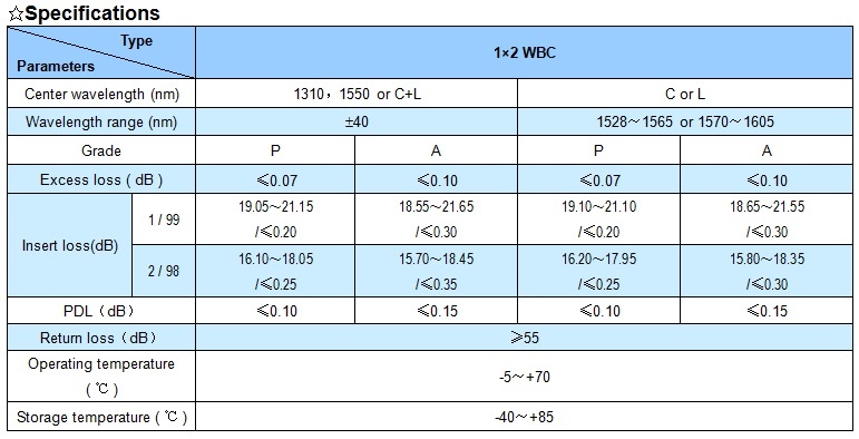 XHP 1×2 1/99 1550nm fiber coupler features low insert loss, high return loss, low PDL, stable and reliable. It can be integrated into fiber communication network, fiber sense system, and fiber test equipment etc.