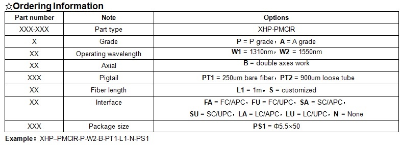 XHP PM fiber circulator features low insert loss, high return loss, high extinction ratio, stable and reliable. It can be integrated into PM fiber amplifier, fiber sense, and fiber testing equipment etc.