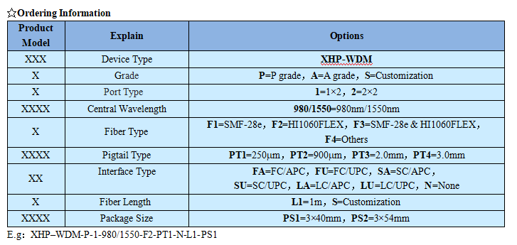 The 980/1550 single mode fiber wavelength division multiplexer(XHP-WDM980/1550), produced by XHP ,features low insertion loss, high return loss, low PDL, as well as stable and reliable performance. It is suitable for fiber communication network, fiber amplifier, fiber laser,fiber sensing system , fiber test equipment , etc.
