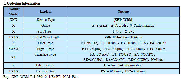 The 980/1064 single mode fiber wavelength division multiplexer(XHP-WDM980/1064), produced by XHP ,features low insertion loss, high return loss, low PDL, as well as stable and reliable performance. It is suitable for fiber amplifier, fiber laser , fiber test equipment , etc.