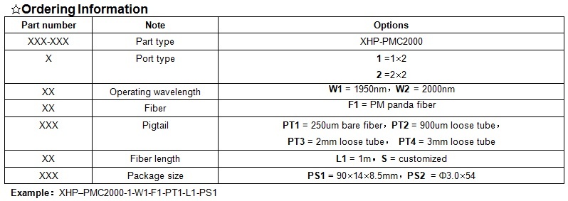 XHP 2000nm polarization maintaining fiber coupler features low insert loss, wavelength and coupling ratio can be customized, stable and reliable. It can be integrated into fiber gyroscope, fiber sense, fiber measuring equipment and PM fiber amplifier etc.