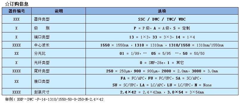 讯鸿(XHP)生产的1×3/1×4单模光纤耦合器(XHP-FBT1X4)插入损耗低,回损高,PDL小,稳定可靠。适用于光纤通讯网络、光纤传感系统、高功率光纤放大器功率分配和光纤测试设备等。