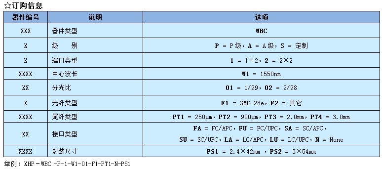 讯鸿(XHP)生产的1/99 1550WBC单模光纤耦合器(XHP-FBT1/99)插入损耗低,回损高,PDL小,稳定可靠。适用于光纤放大器、光纤传感系统和光纤测试设备。