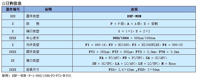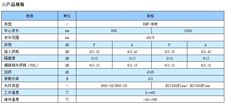 讯鸿(XHP)生产的980/1064单模光纤耦合器(XHP-WDM980/1064)插入损耗低,回损高,PDL小,稳定可靠。适用于光纤放大器、光纤激光器和光纤测试设备等。