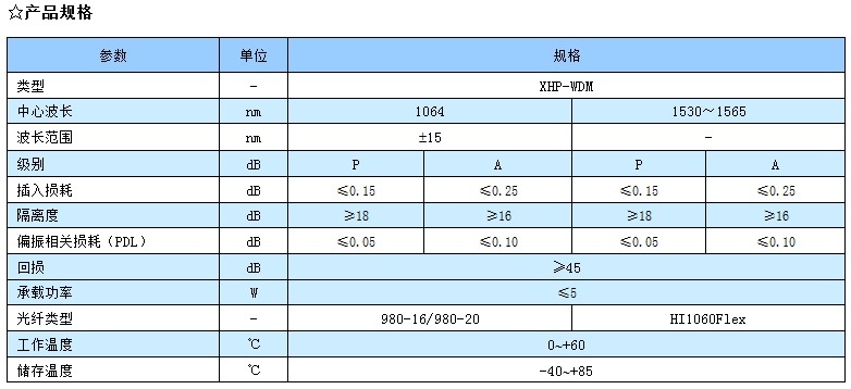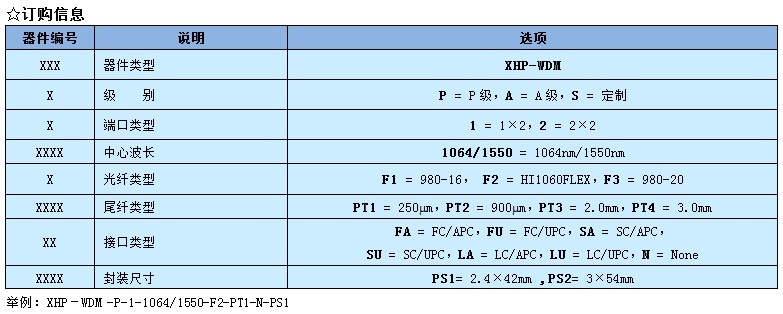 讯鸿(XHP)生产的980/1064单模光纤耦合器(XHP-WDM980/1064)插入损耗低,回损高,PDL小,稳定可靠。适用于光纤放大器、光纤激光器和光纤测试设备等。
